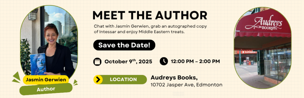 Chat with Jasmin Gerwien and get your signed copy of her memoir of her remarkable mother, Intessar. Born in Jaffa, Palestine, Intessar moved to Kuwait, where Jasmin was born, as a young bride, and later to Canada. Jasmin’s memoir tells of her family’s history in Palestine, their displacement from their home and how they made a new life in Kuwait, Egypt and Canada.